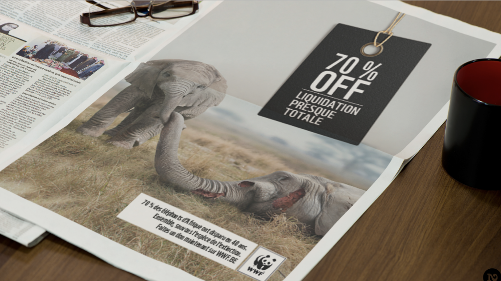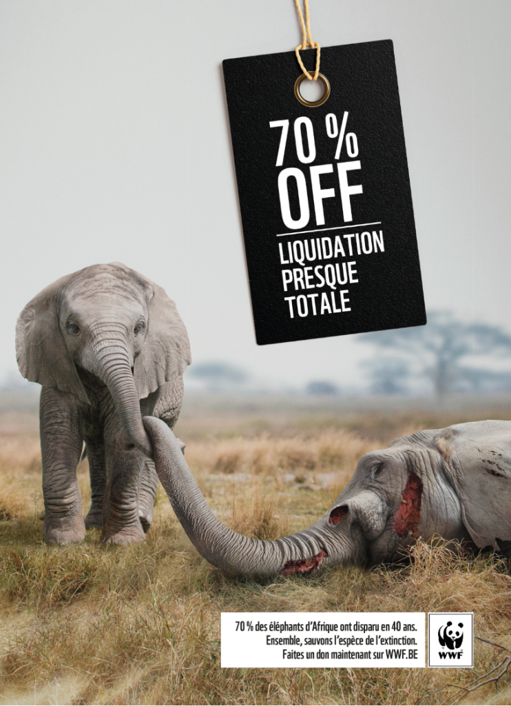 L’idée: adoptez un ton audacieux, sérieux et alarmant pour informer les citoyens sur la situation des éléphants. Utiliser les codes de communication commerciale pour une campagne lancée en pleine période de solde !